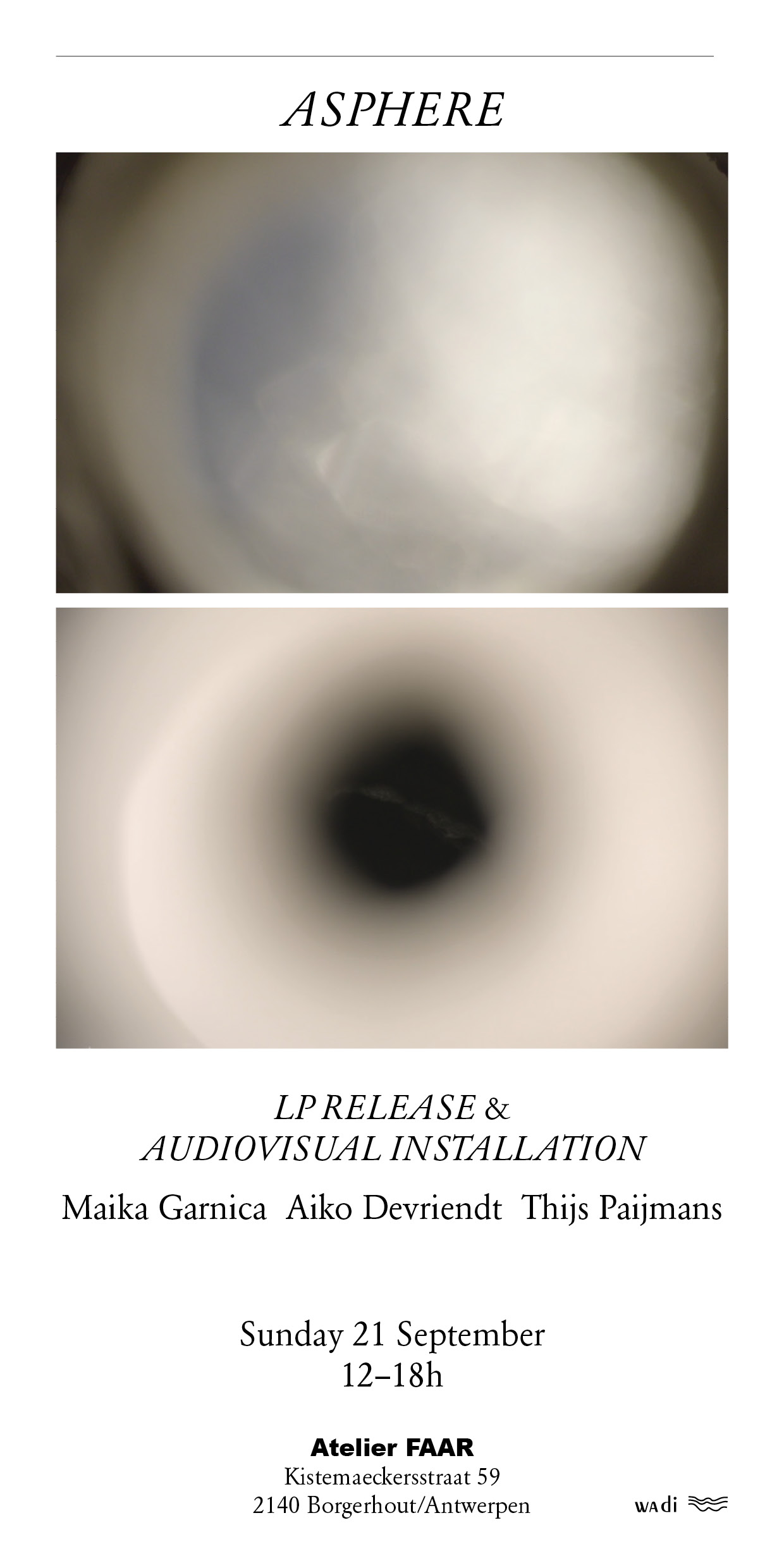 Asphere originates from the ongoing dialogue and friendship among the artists Maika Garnica, Aiko Devriendt and Thijs Paijmans, as shared experiences of time and space. The album takes Garnica’s sound objects and their visual aesthetics and sounds, as a ground for